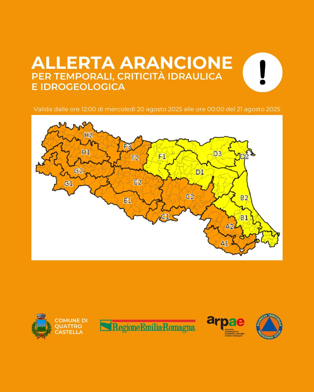 Il Servizio Meteo della Regione Emilia Romagna ha diramato un ALLERTA ARANCIONE per rischio idrogeologico valida dalle ore 12 fino alle 23:59 di mercoledì 20 agosto. In particolare, sono previsti vari impulsi temporaleschi, localmente di forte intensità, con possibili effetti e danni associati. Le precipitazioni previste potranno generare rapidi innalzamenti dei livelli idrometrici nei corsi d’acqua del settore centro occidentale della regione con diffusi superamenti delle soglie 2 e possibili localizzati superamenti della soglia 3. Nelle aree interessate dalle precipitazioni intense potranno verificarsi diffusi ruscellamenti e fenomeni franosi lungo i versanti e innalzamenti rapidi dei livelli idrometrici di rii e torrenti con possibili fenomeni erosivi spondali. Per tutta la giornata di domani giovedì 21 agosto è emessa un’ALLERTA GIALLA causa condizioni di instabilità con possibilità di temporali, localmente anche di forte intensità, con possibili effetti e danni associati, in particolare sul settore orientale e zone di pianura settentrionali nelle prime ore della notte. Saranno ancora possibili ruscellamenti lungo i versanti e piene dei corsi minori nelle aree interessate dalle precipitazioni, oltre che localizzati fenomeni franosi, anche a seguito delle precipitazioni del giorno precedente. Come sempre in questi casi si raccomanda la massima prudenza e attenzione.